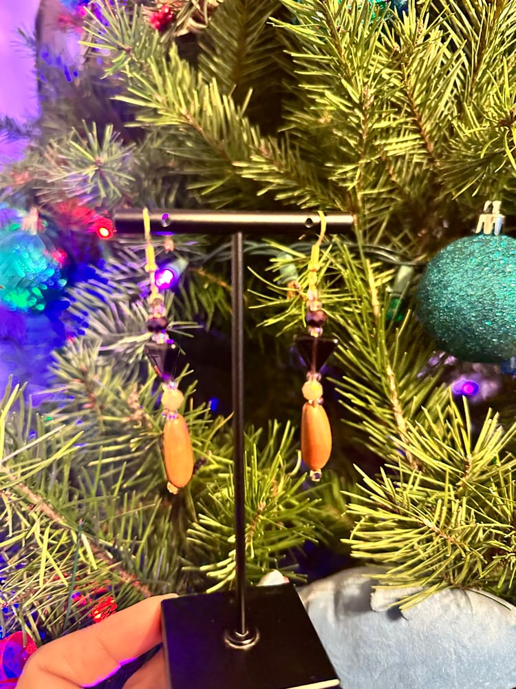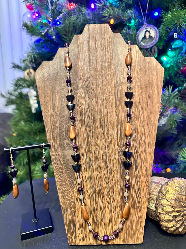 The beauty of this set is hard to capture in photos. Necklace and earring set in deep amethyst purple, pine nuts, tan, light and gold beads. Also has a leather necklace strap.