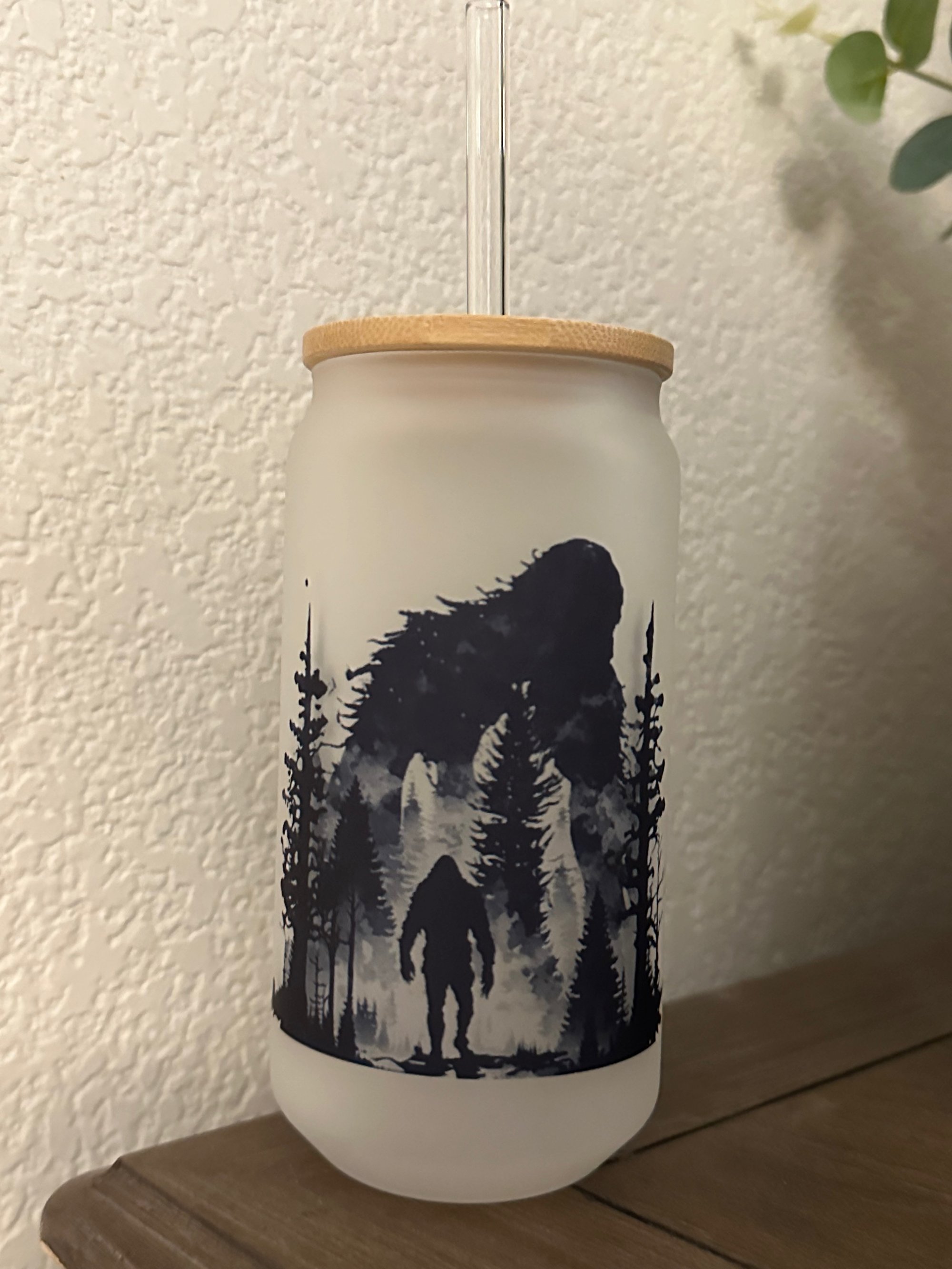 18oz frosted glass can with BigFoot in the woods design. Includes bamboo lid and glass straw.