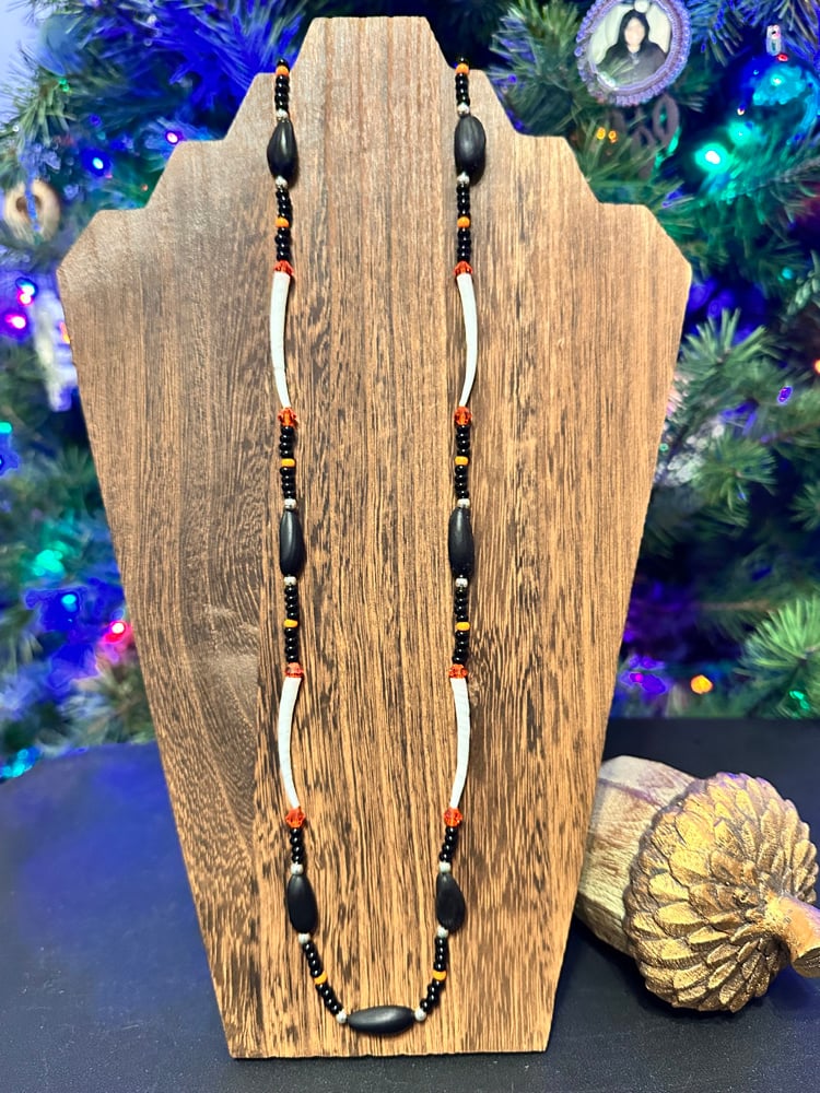 Single strand necklace with black pinenuts, dentalium shells, black, orange and silver beads.