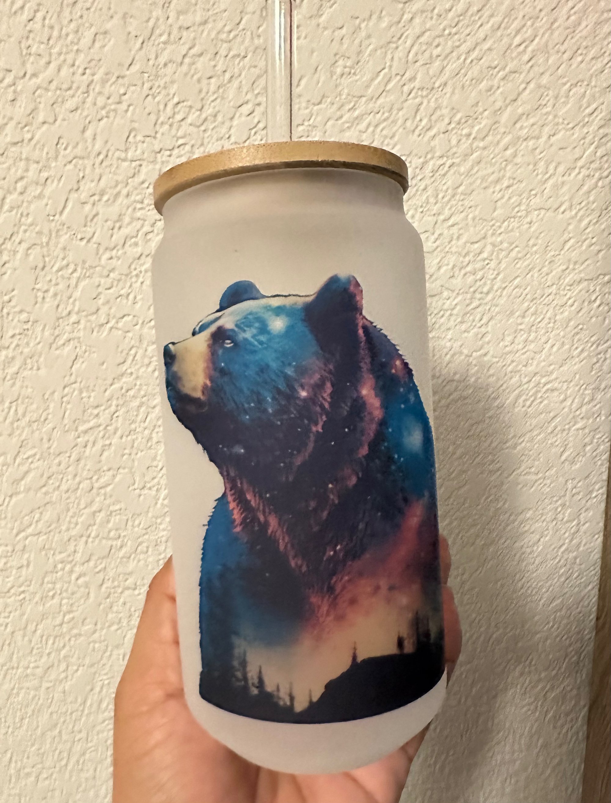 18oz frosted glass can with cosmo bear design. Includes bamboo lid and glass straw.