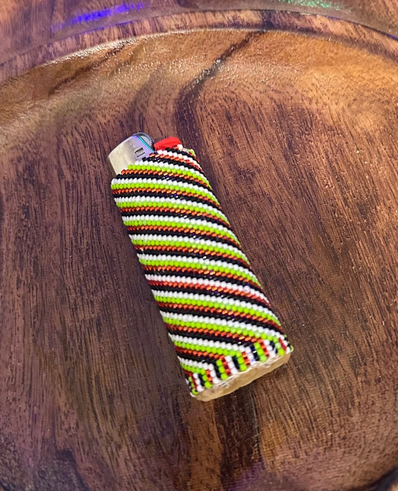 Metallic red, lime green, black and white lighter. Lighter can be replaced.